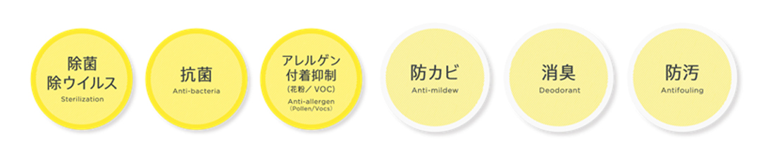 抗菌状態を保ちながら、花粉、VOCなどのアレルゲンや、カビ、汚れ、臭いも持続的に抑制します。