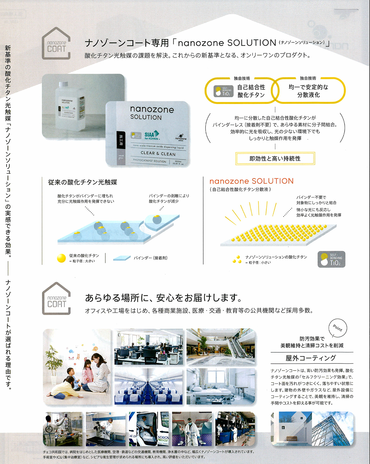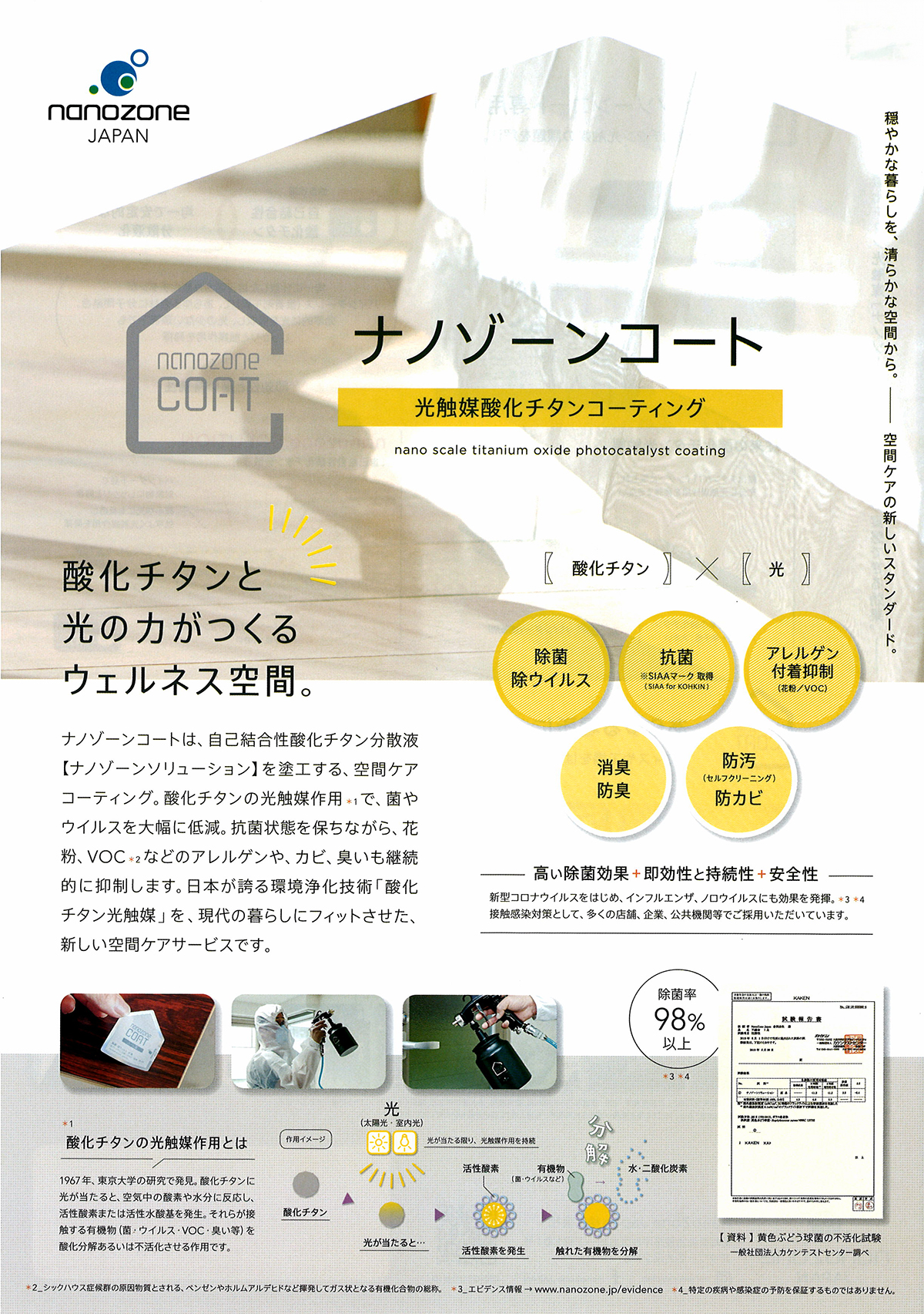 ナノゾーンソリューションを噴霧する空間ケアコーティング。酸化チタンの光触媒作用で、菌やウイルスを大幅に低減。